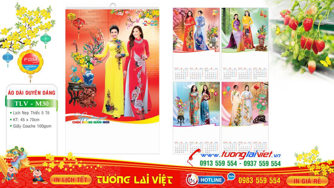 Lịch 5 tờ nẹp thiếc thường được in Offset 1 mặt trên giấy C105gsm, có kích thước: 36×70 và 45x70cm. Lịch 5 tờ Áo dài là mẫu lịch tờ treo tường giá rẻ nên được nhiều cửa hàng nhỏ lẻ chọn in lịch tết năm nay để làm quà tặng cuối năm cho khách hàng, bạn bè, đối tác và người thân nhân dịp năm mới.
