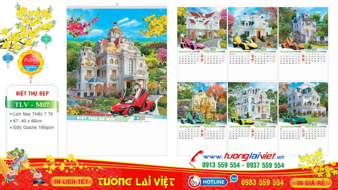 Lịch 7 tờ nẹp thiếc thường được in Offset 1 mặt trên giấy C105gsm, có kích thước: 36×70 và 45x70cm. Lịch 7 tờ Biệt thự xe hơi là mẫu lịch tờ treo tường giá rẻ nên được nhiều cửa hàng nhỏ lẻ chọn in lịch tết năm nay để làm quà tặng cuối năm cho khách hàng, bạn bè, đối tác và người thân nhân dịp năm mới.