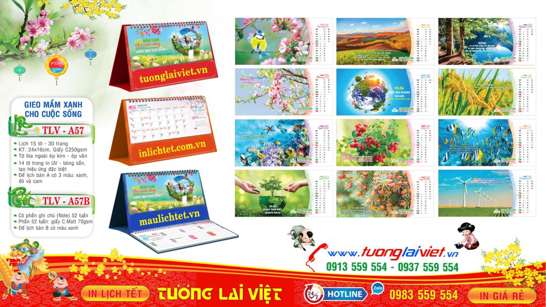 Mẫu Lịch Bàn 15 Tờ Môi Trường Và Cuộc Sống được In TLV sản xuất theo kích thước 24×16 và 16×23. Bên cạnh đó thường có 2 kiểu dáng: Lịch Để Bàn chữ A và Lịch Để Bàn chữ M có thêm phần Note Ghi Chú bên dưới.
